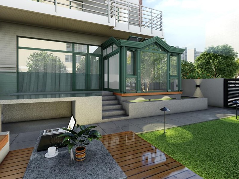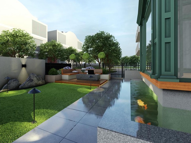 主要区域为:过道、休闲平台、景观鱼池、种植绿化区。地面采用了石英砖铺设、植物多数为常绿矮灌,主要是为了便于打理,突出简约的理念。平台使用了塑木材质,暖色系让人们更加愿意选择、接受,选择塑木的原因是因为其寿命、打理方面胜过普通防腐木。