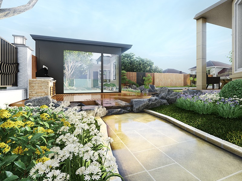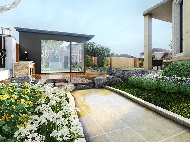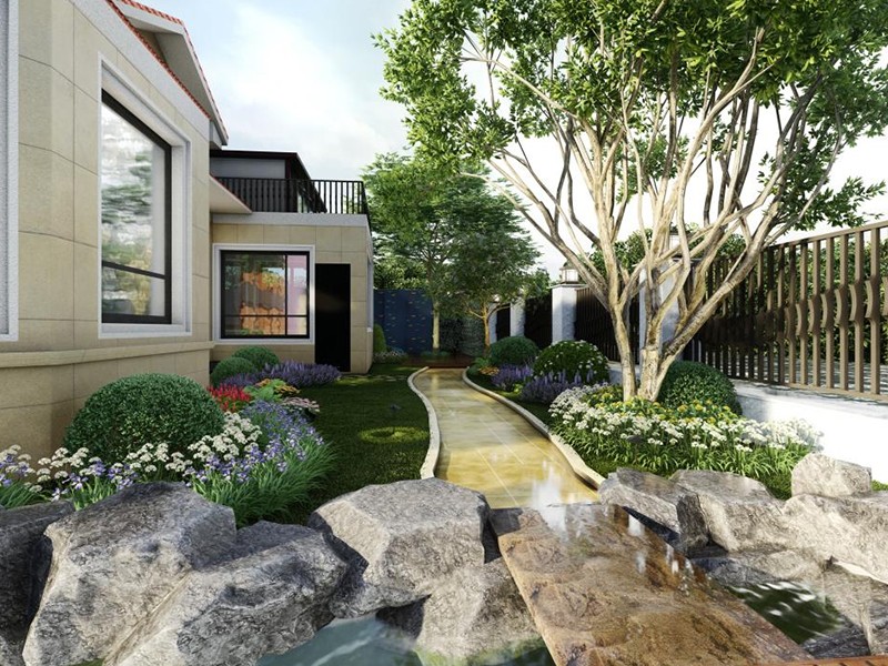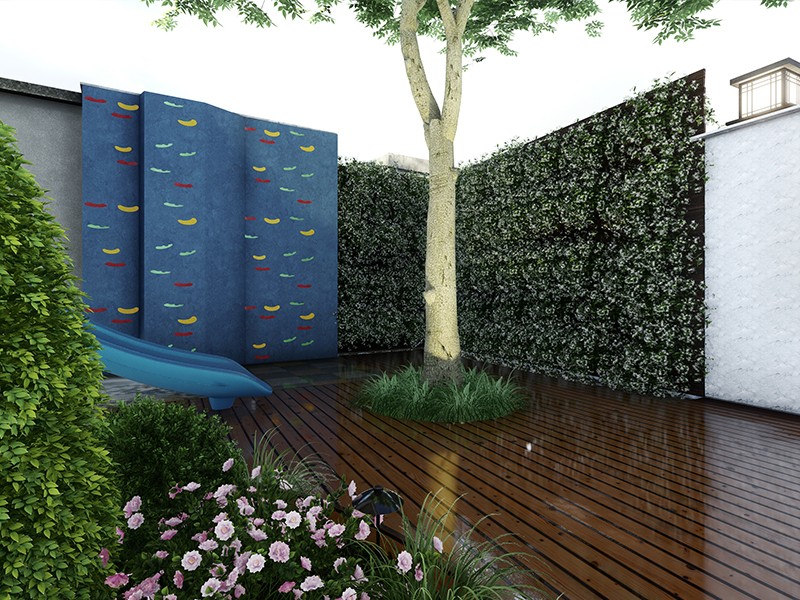 设计理念:设计理念起初为美式庭院的“自然的纯真、朴实、充满活力”,其设计理念产生了深远的影响力,造就美国充满了自由、奔放的天性。美国人在对自然的好奇和热爱中了解自然、融入其中,把它引入自己的生活,庭院和花园中。但后期经过与业主沟通还是添加了一座生态鱼池,这样既满足生态、环保,又满足了业主空闲时间想与儿女一起喂鱼的想法。在院子的西南角设计了一个儿童娱乐区,内设攀爬墙、滑滑梯等儿童娱乐设备,使孩子的童年更加美好。